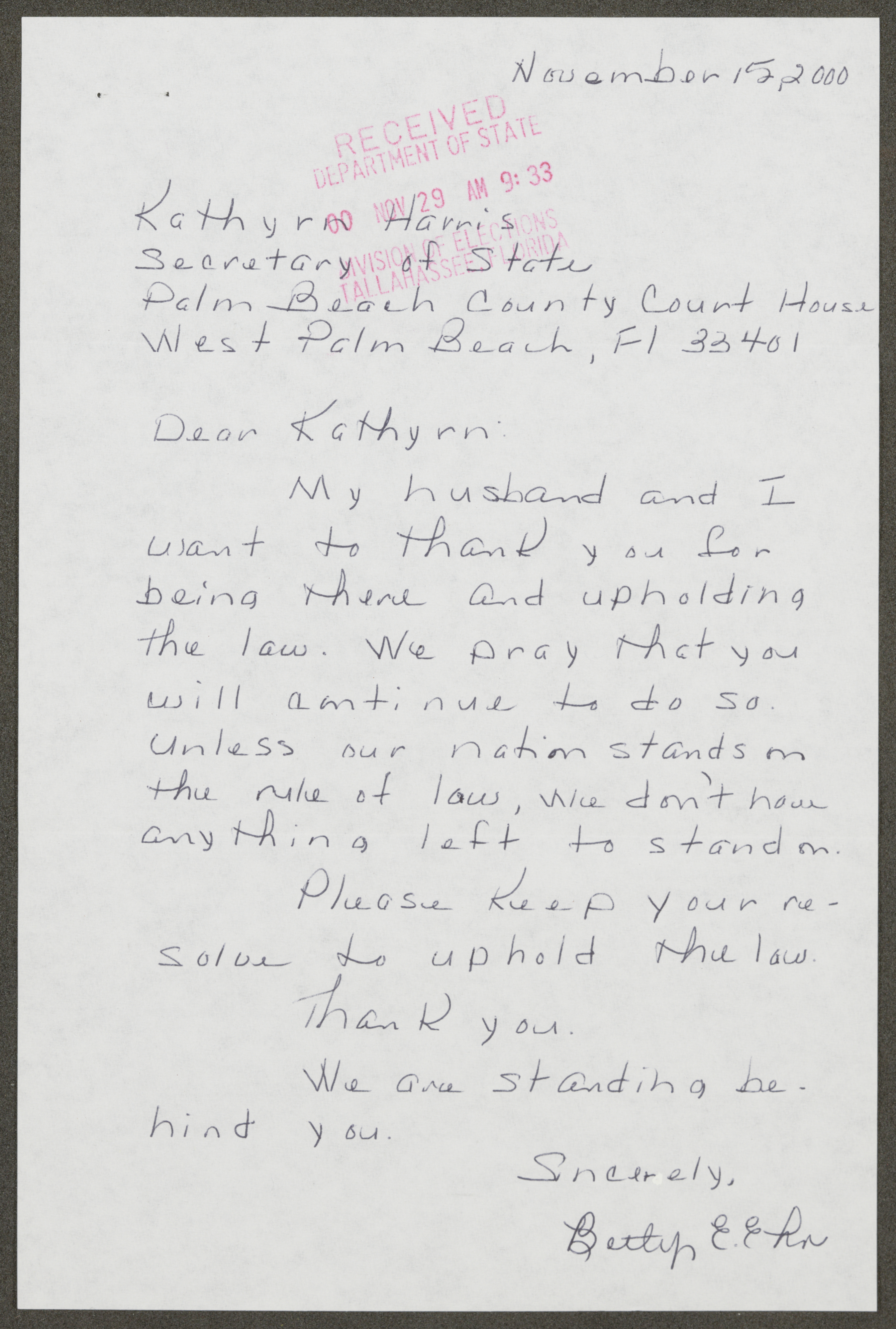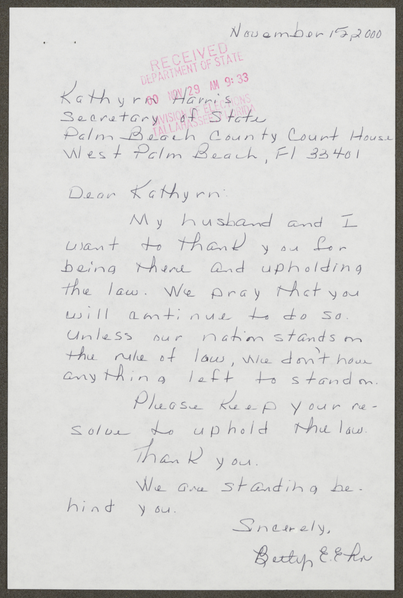 Ehn, Betty E. Letter from Betty E. Ehn to Secretary Katherine Harris Regarding the Presidential Election, 2000. 2000-11-15. State Archives of Florida, Florida Memory. <https://www.floridamemory.com/items/show/351235>, accessed 15 October 2025.