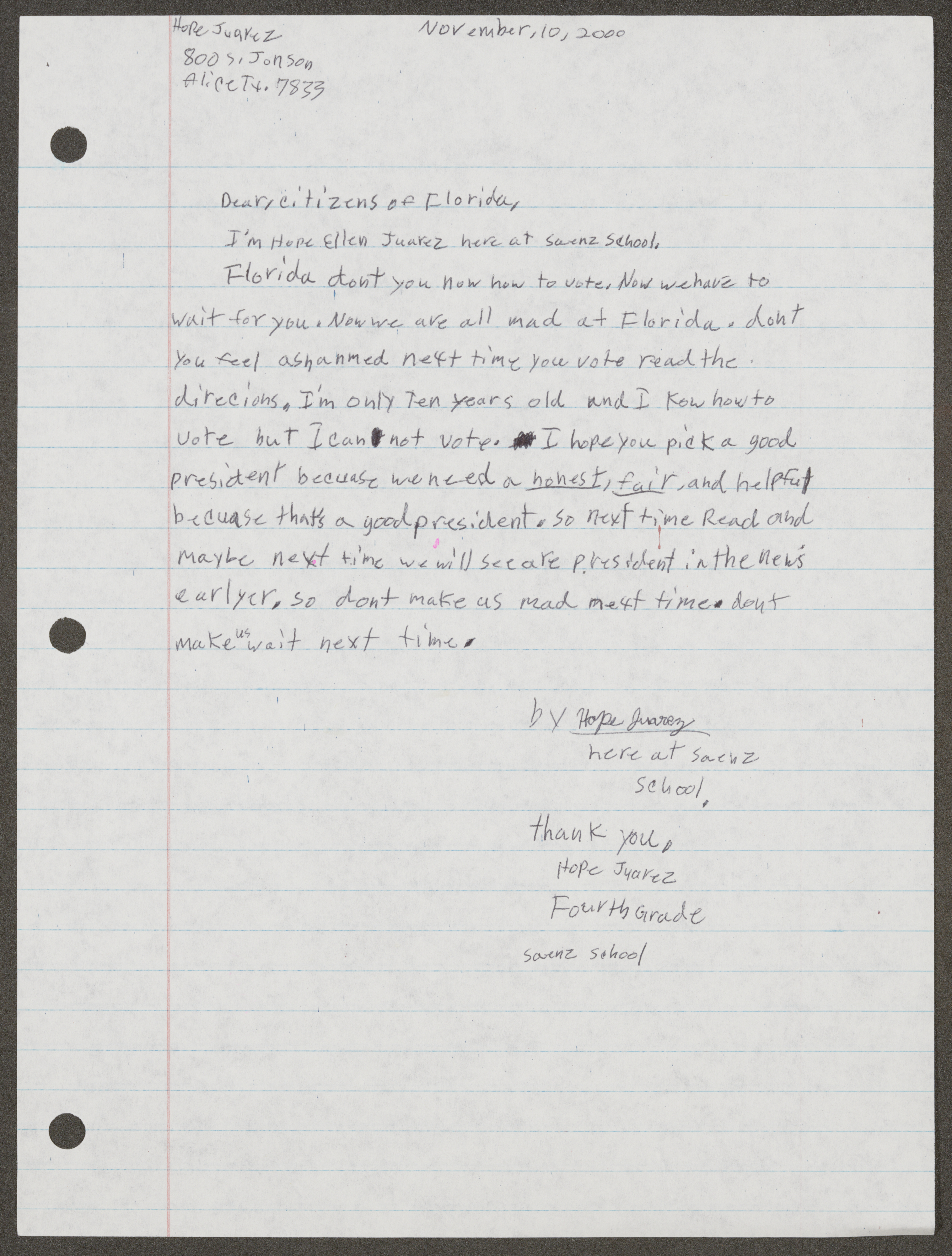 Florida don’t you [k]now how to vote. Now we have to wait for you. Now we are all made at Florida. don't you feel ashanmed [sic] next time you vote read the direcions [sic]. I'm only ten years old and I k[n]ow how to vote but I can not vote. I hope you pick a good president because we need a honest, fair, and helpful because that’s a good president. So next time read and maybe next time we will see are president in the news earlyer [sic]. So don't make us mad next time. don't make us wait next time.