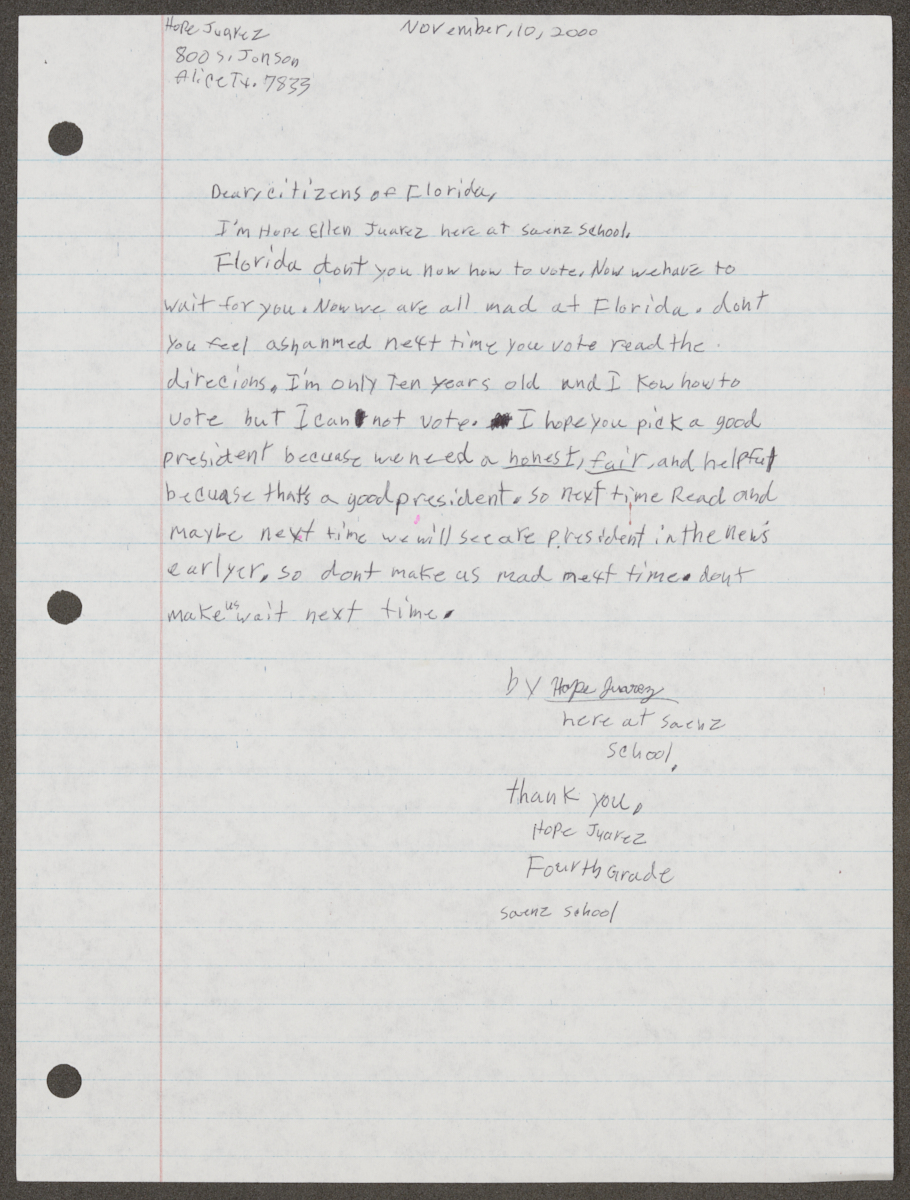 Juarez, Hope Ellen. Letter from Hope Ellen Juarez to the Citizens of Florida Regarding the Presidential Election, 2000. 2000-11-10. State Archives of Florida, Florida Memory. <https://www.floridamemory.com/items/show/351236>, accessed 15 October 2025.