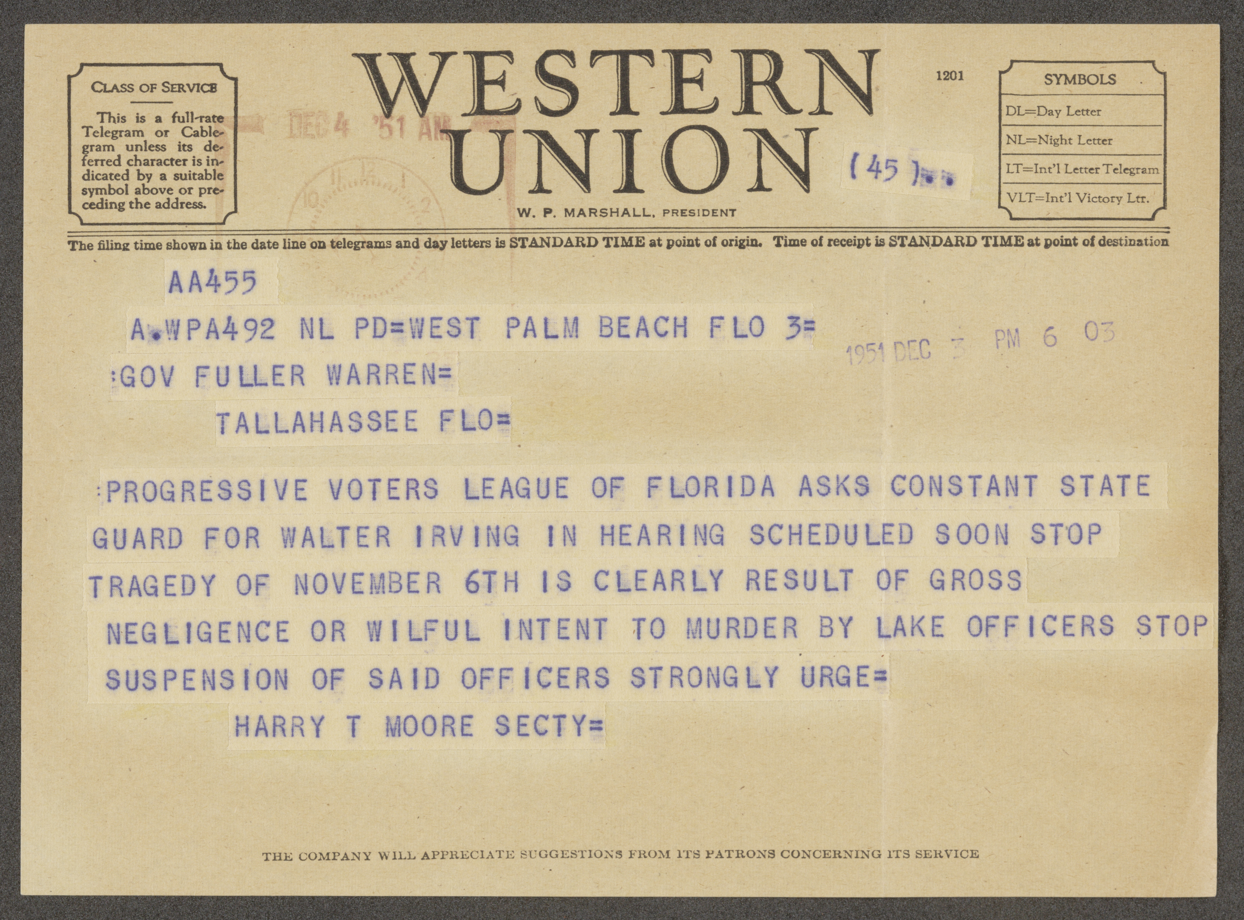 Moore, Harry T. (Harry Tyson), 1905-1951. Telegram from Harry T. Moore on Behalf of the Progressive Voters League to Governor Fuller Warren, 1951. 1951-12-03. State Archives of Florida, Florida Memory. <https://www.floridamemory.com/items/show/351361>, accessed 17 February 2026.