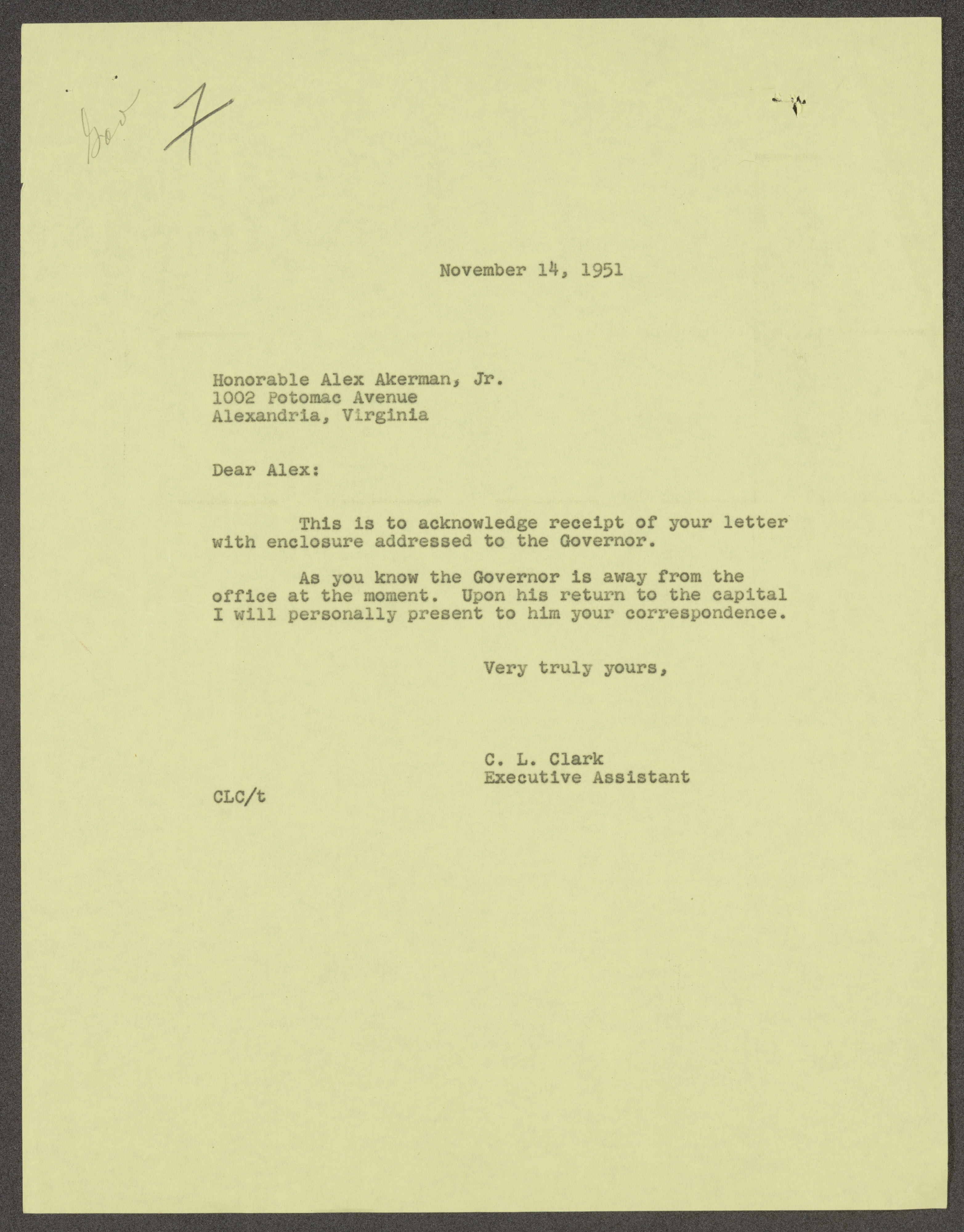 Clark, Charles Langford, 1905-1976. Letter from C. L. Clark to Alex Akerman, Jr. Regarding Correspondence with Governor Fuller Warren, 1951. 1951-11-14. State Archives of Florida, Florida Memory. Accessed 17 Feb. 2026.<https://www.floridamemory.com/items/show/351362>