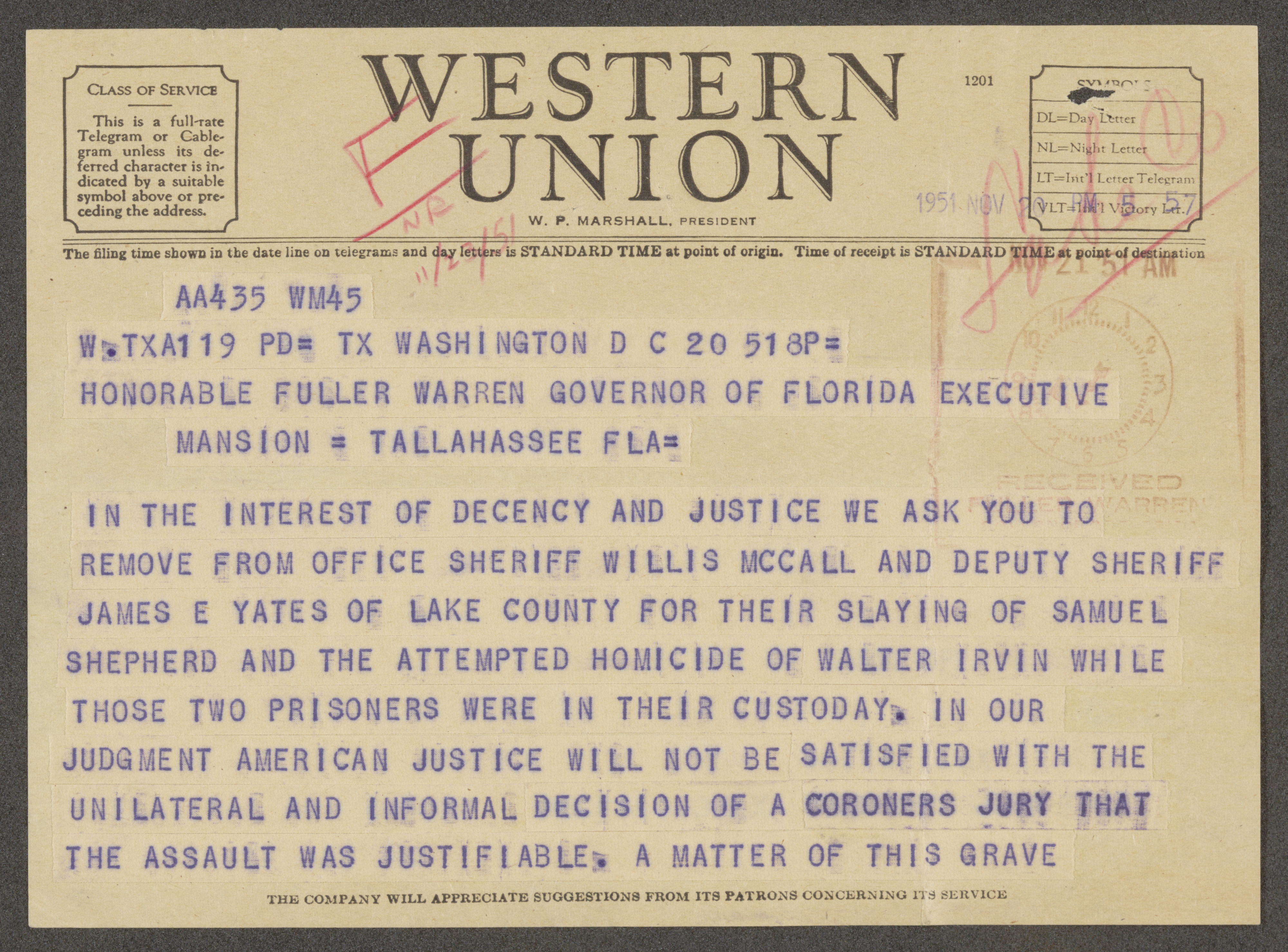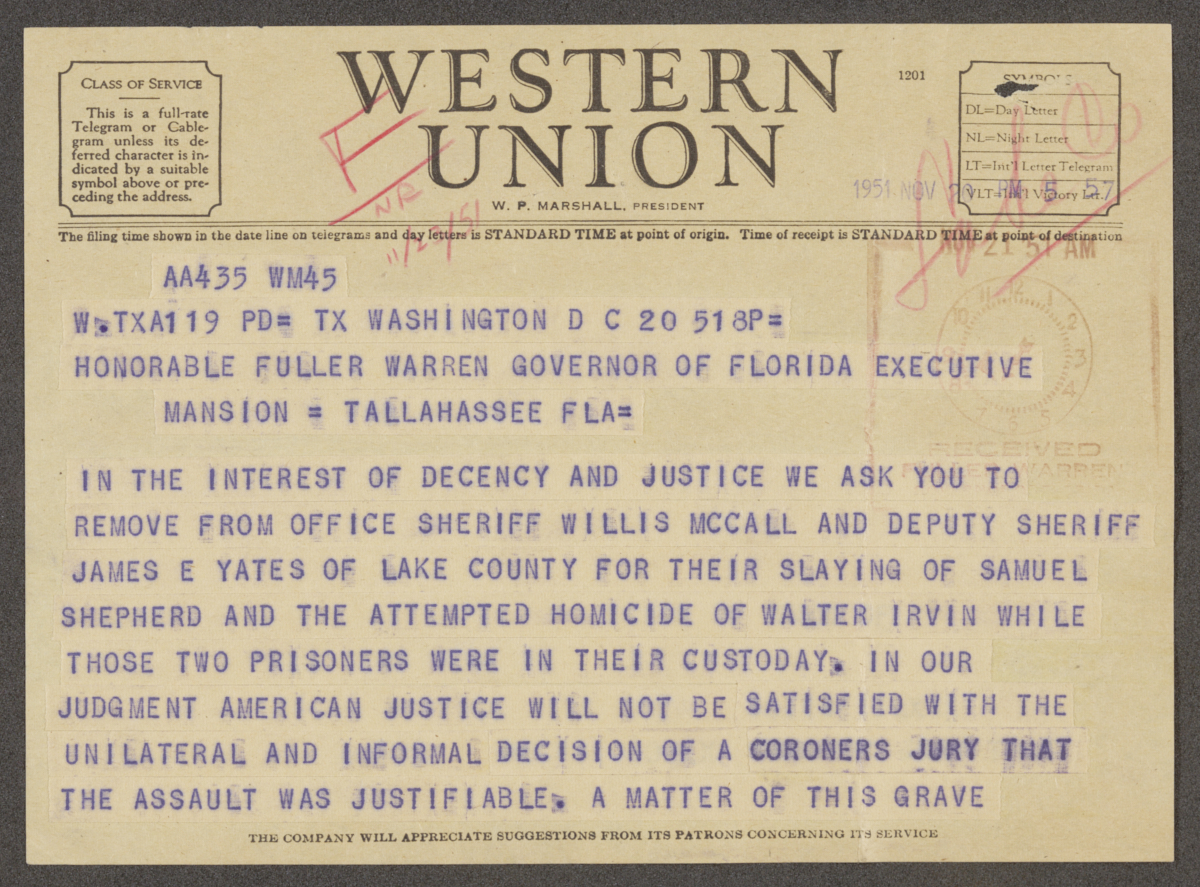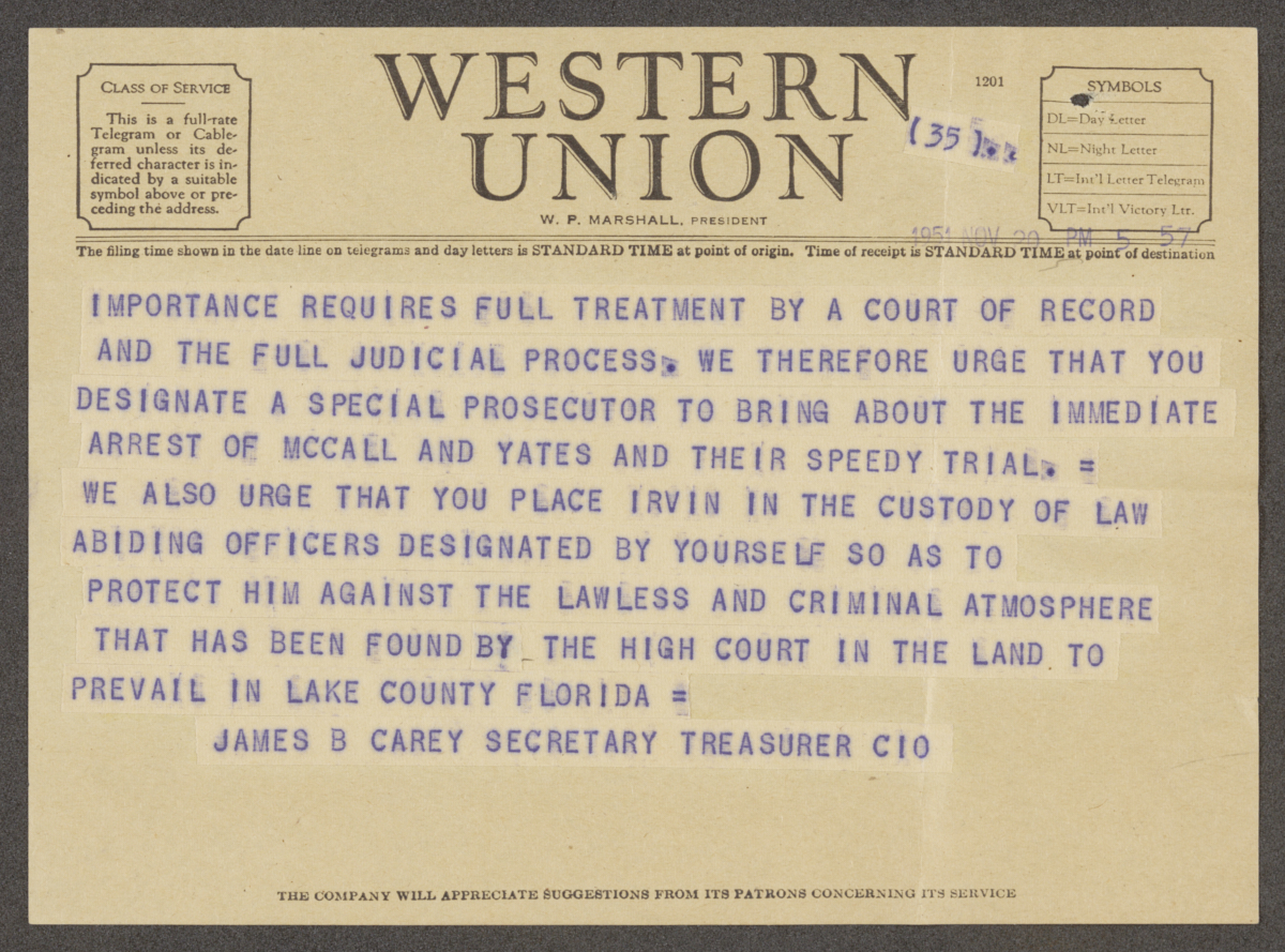 Carey, James B. Telegram from James B. Carey to Governor Fuller Warren, 1951. 1951-11-20. State Archives of Florida, Florida Memory. <https://www.floridamemory.com/items/show/351363>, accessed 17 February 2026.