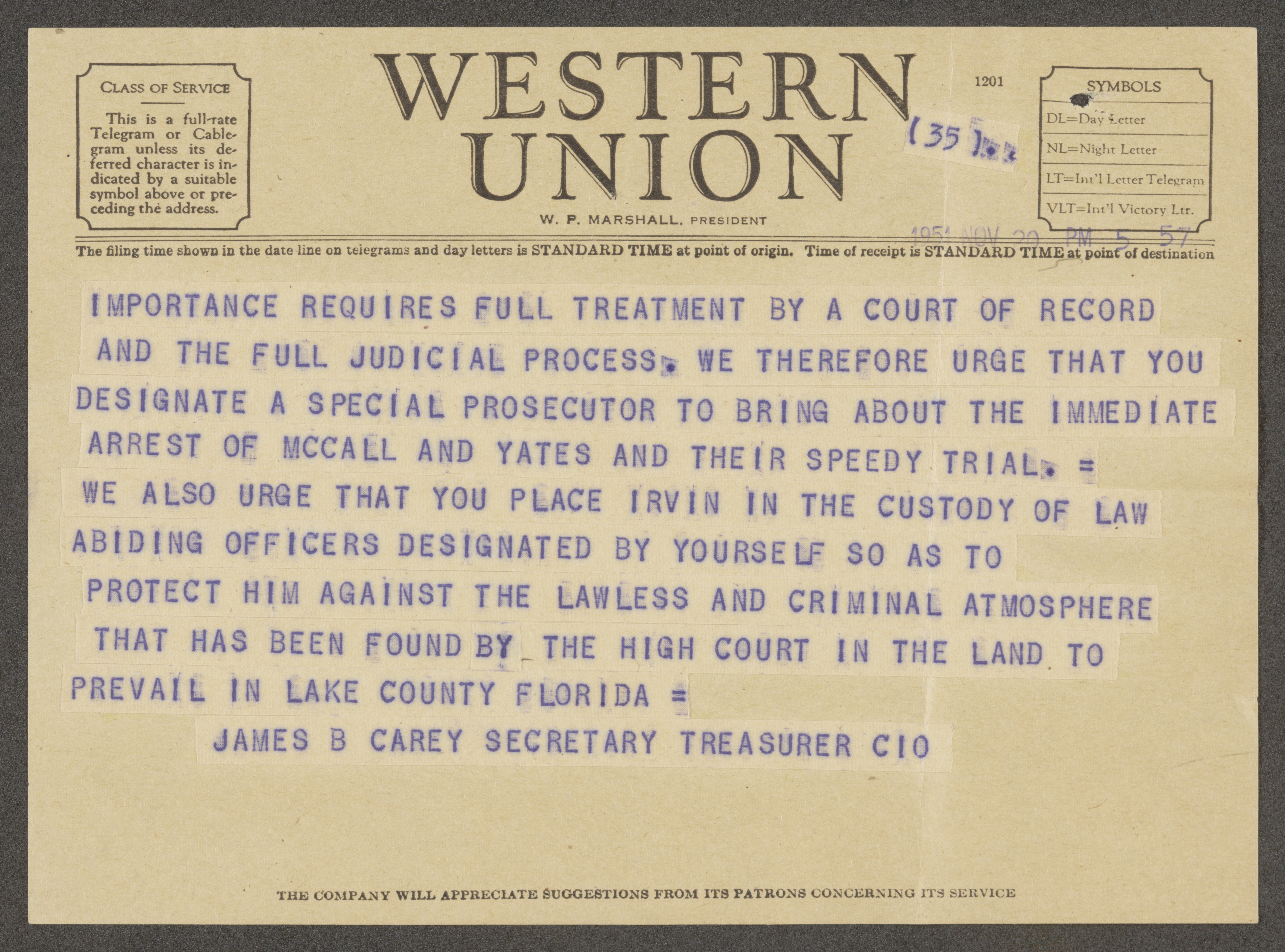Carey, James B. Telegram from James B. Carey to Governor Fuller Warren, 1951. 1951-11-20. State Archives of Florida, Florida Memory. <https://www.floridamemory.com/items/show/351363>, accessed 17 February 2026.
