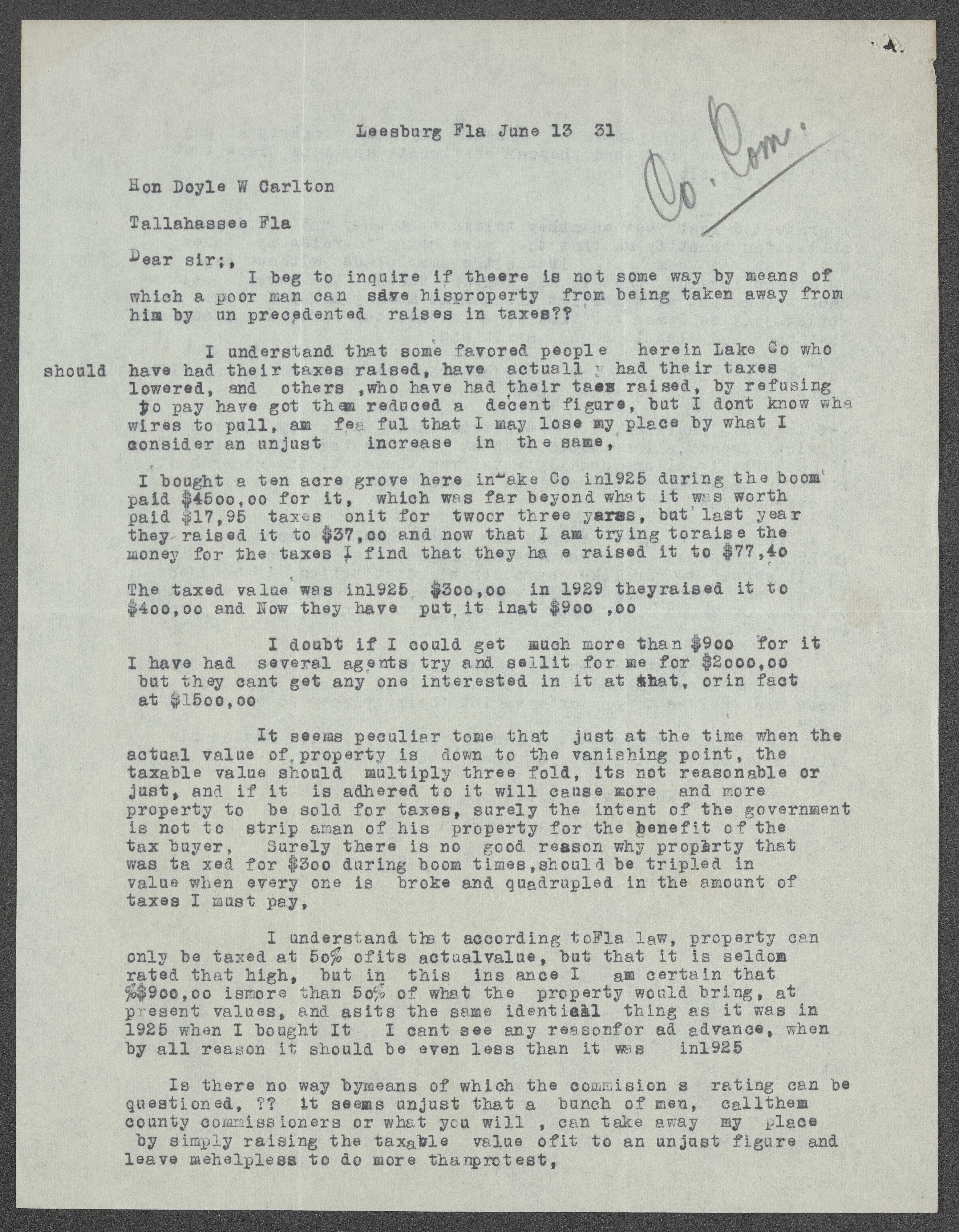 Correspondence Between H. Bain and Governor Doyle E. Carlton Regarding Increased Property Taxes, 1931