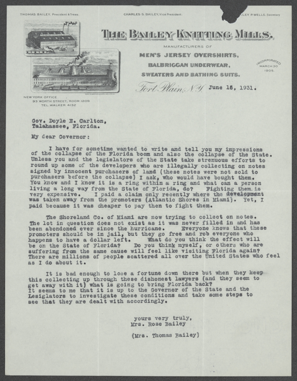 Correspondence Between Rose Bailey and Governor Doyle E. Carlton Regarding the End of the Land Boom, 1931