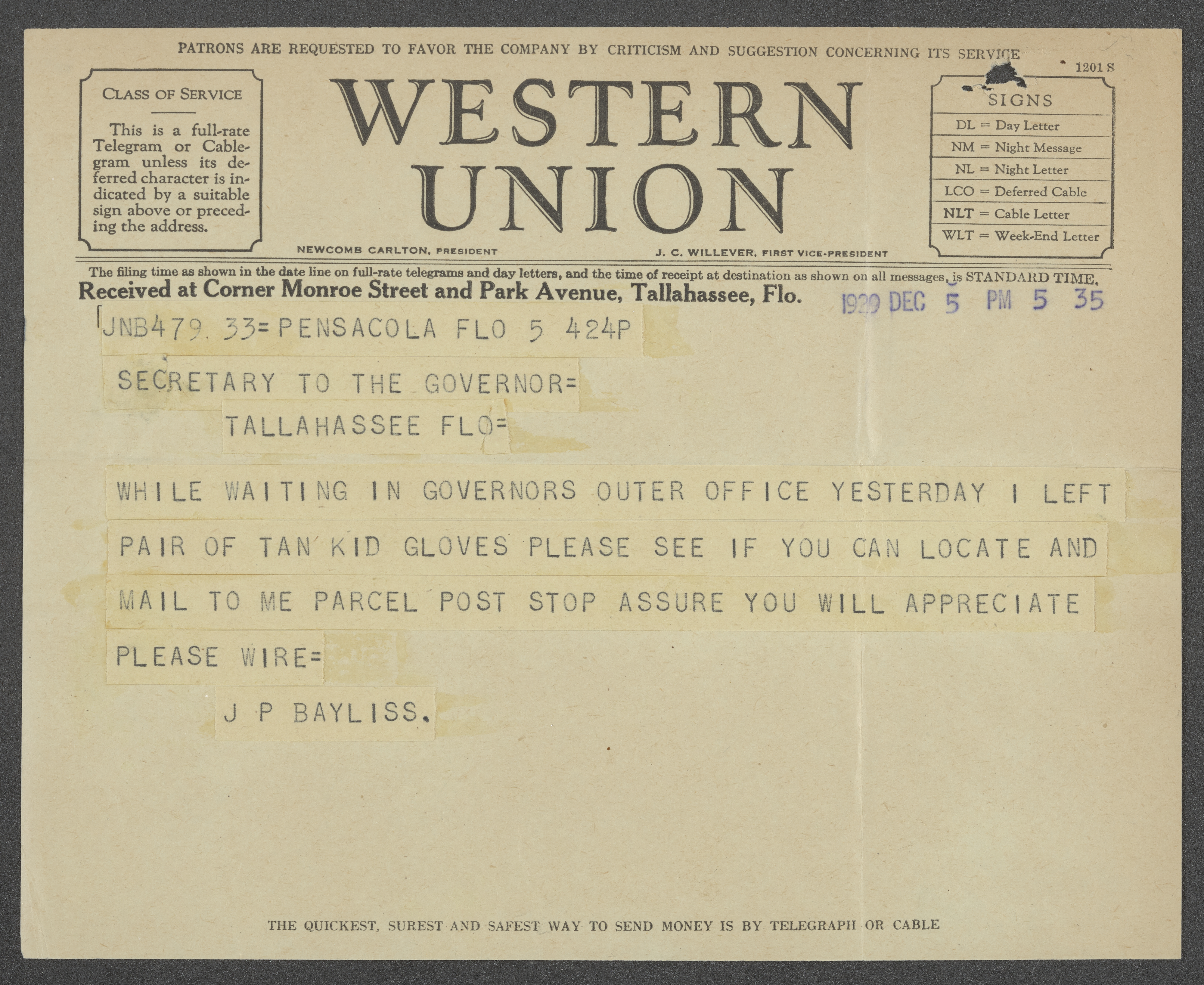 Correspondence Between J. P. [J. H.] Bayliss and the Secretary to the Governor, 1929