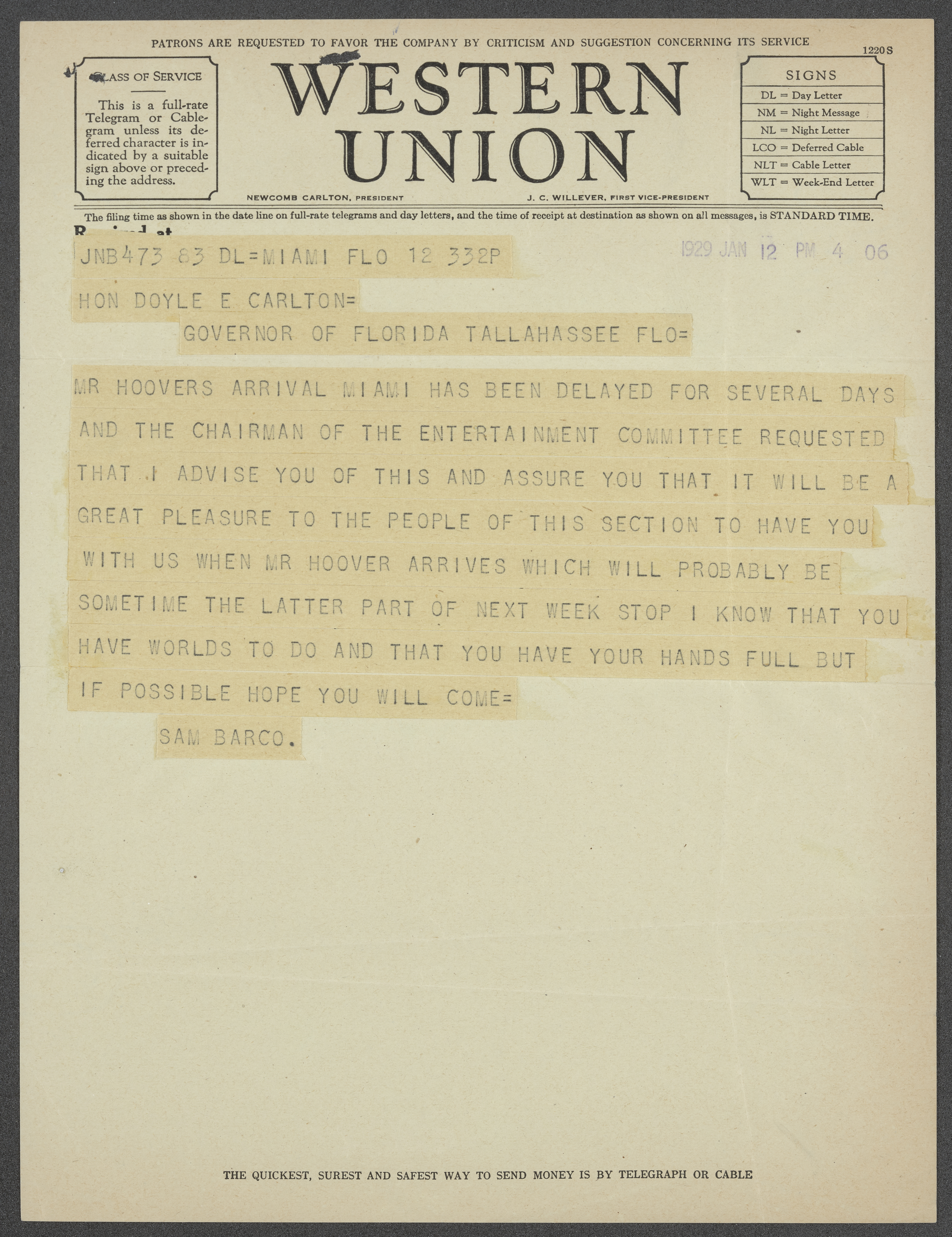 Correspondence Between Governor Doyle E. Carlton and Judge Sam Barco Regarding President-Elect Herbert Hoover's Upcoming Visit to Miami, 1929