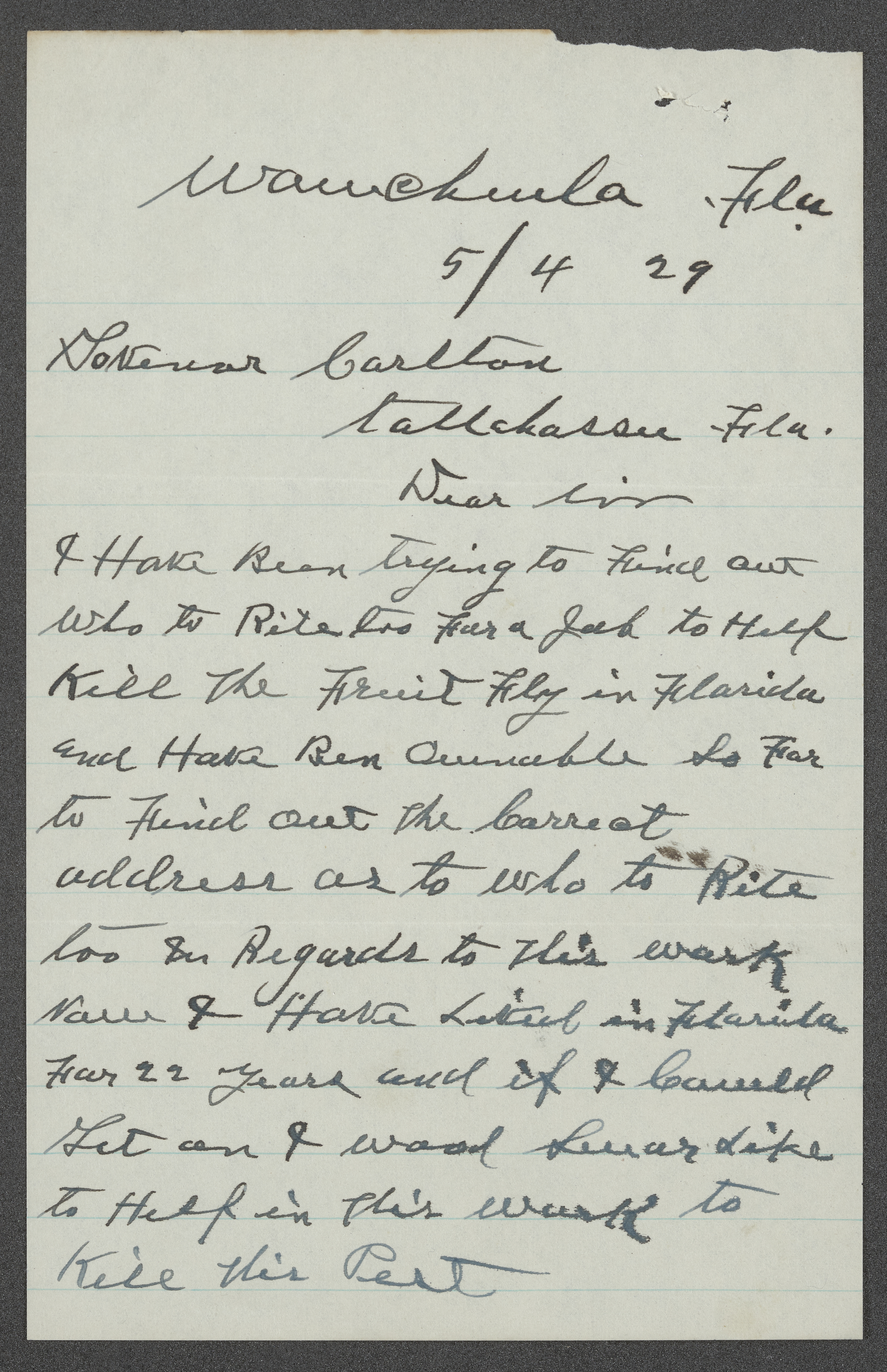 Correspondence Between A. J. Baxter and Governor Doyle E. Carlton Regarding Fruit Fly Extermination, 1929