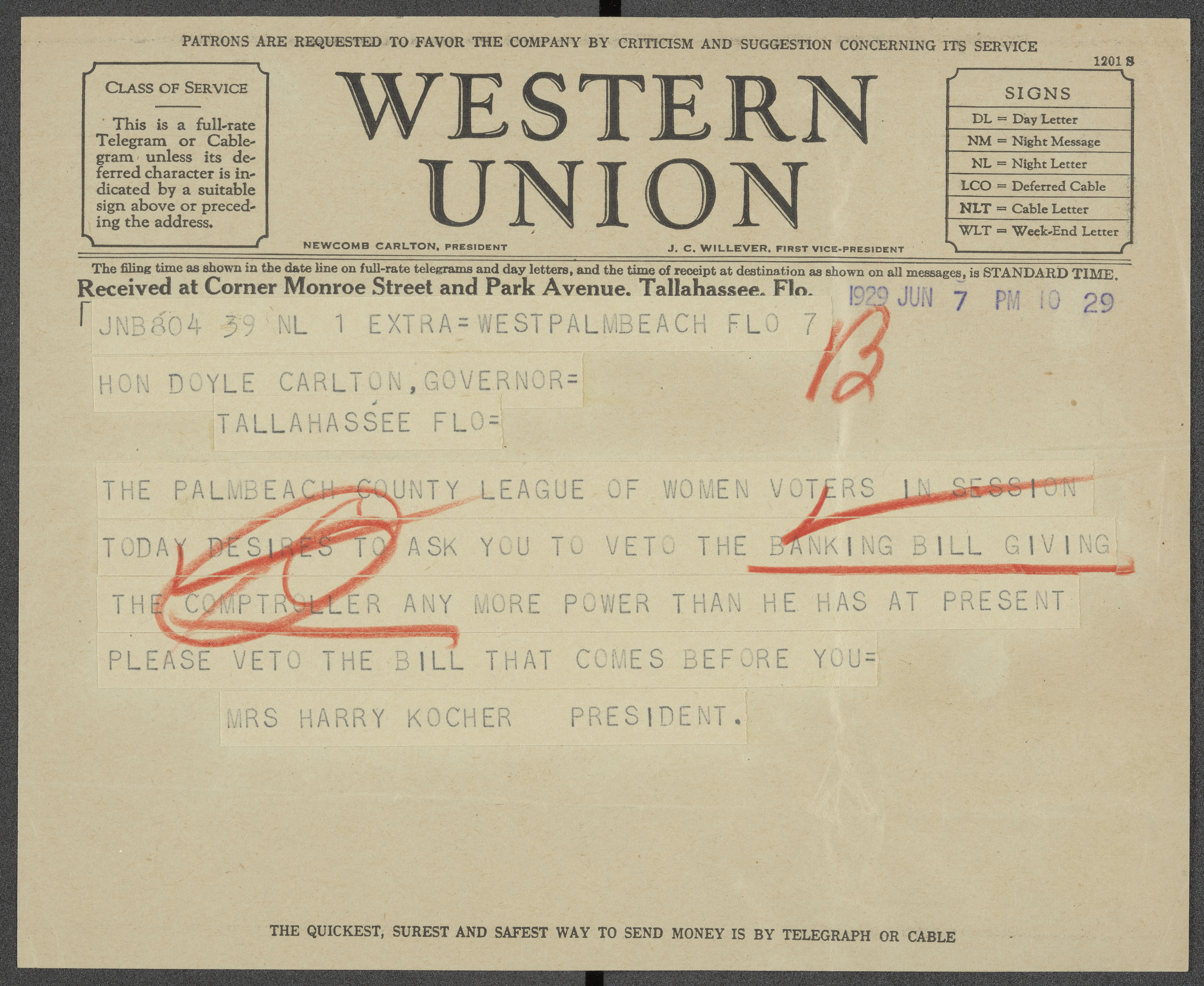 Telegram from the Palm Beach County League of Women Voters to Governor Doyle E. Carlton Regarding a Banking Bill, 1929