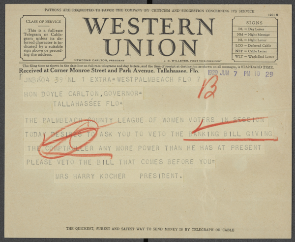 Kocher, Mary E. Telegram from the Palm Beach County League of Women Voters to Governor Doyle E. Carlton Regarding a Banking Bill, 1929. 1929-06-07. State Archives of Florida, Florida Memory. <https://www.floridamemory.com/items/show/351385>, accessed 16 February 2026.