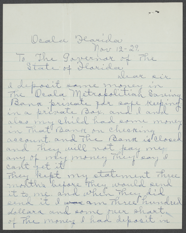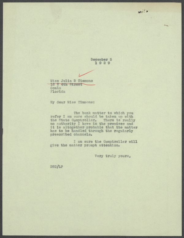 Timmons, Julia B. Correspondence Between Julia B. Timmons and Governor Doyle E. Carlton Regarding Ocala's Metropolitan Savings Bank, 1929. 1929-11-12. State Archives of Florida, Florida Memory. Accessed 16 Feb. 2026.<https://www.floridamemory.com/items/show/351392>