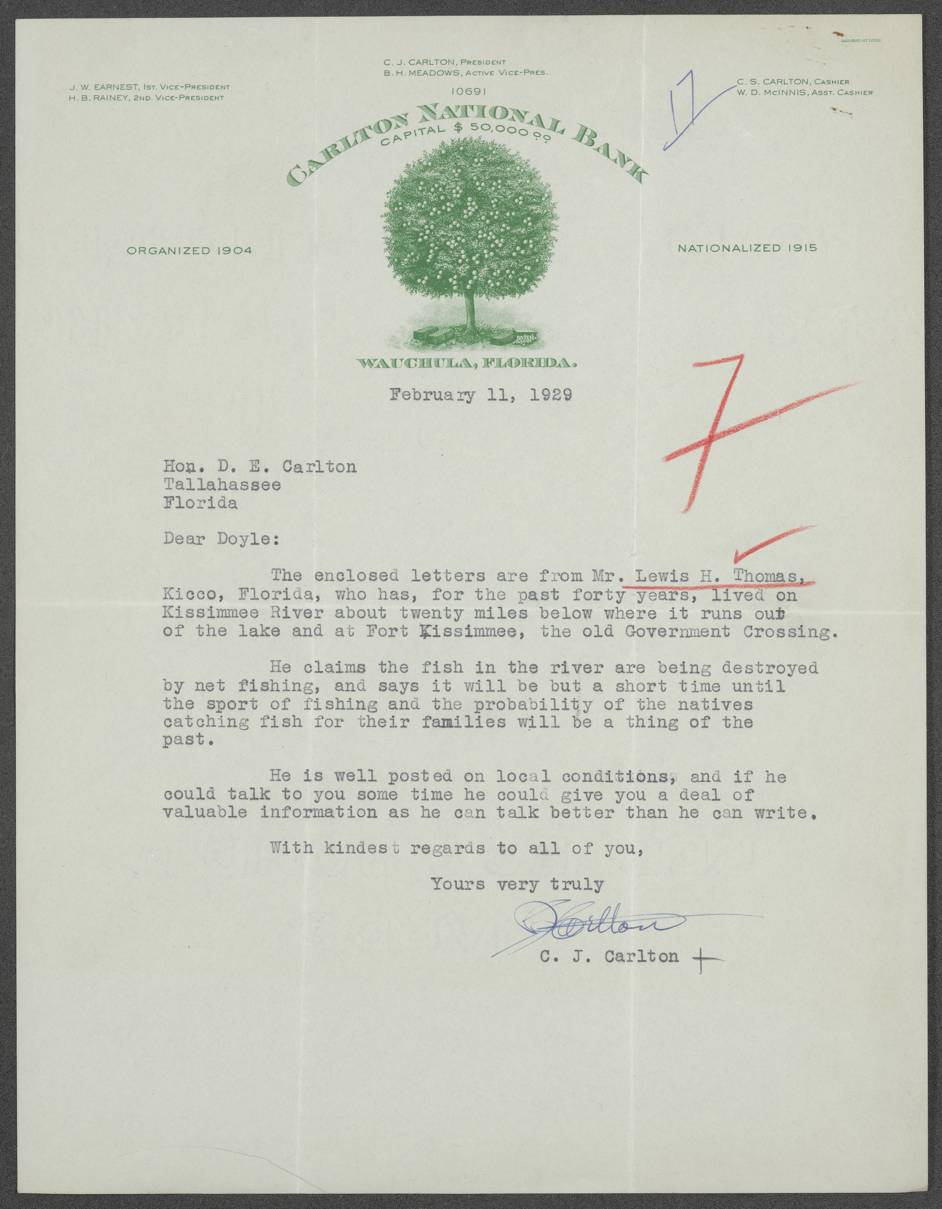 Carlton, Charles Jesse, 1871-1963. Letter from C. J. Carlton to Governor Doyle E. Carlton Regarding Net Fishing, 1929. 1929-02-11. State Archives of Florida, Florida Memory. Accessed 16 Feb. 2026.<https://www.floridamemory.com/items/show/351393>