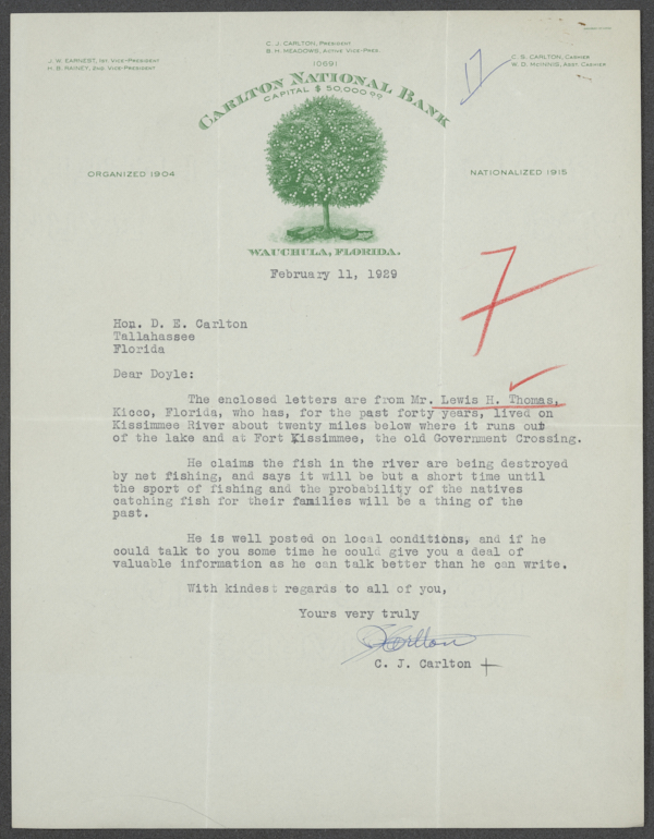 Carlton, Charles Jesse, 1871-1963. Letter from C. J. Carlton to Governor Doyle E. Carlton Regarding Net Fishing, 1929. 1929-02-11. State Archives of Florida, Florida Memory. <https://www.floridamemory.com/items/show/351393>, accessed 16 February 2026.