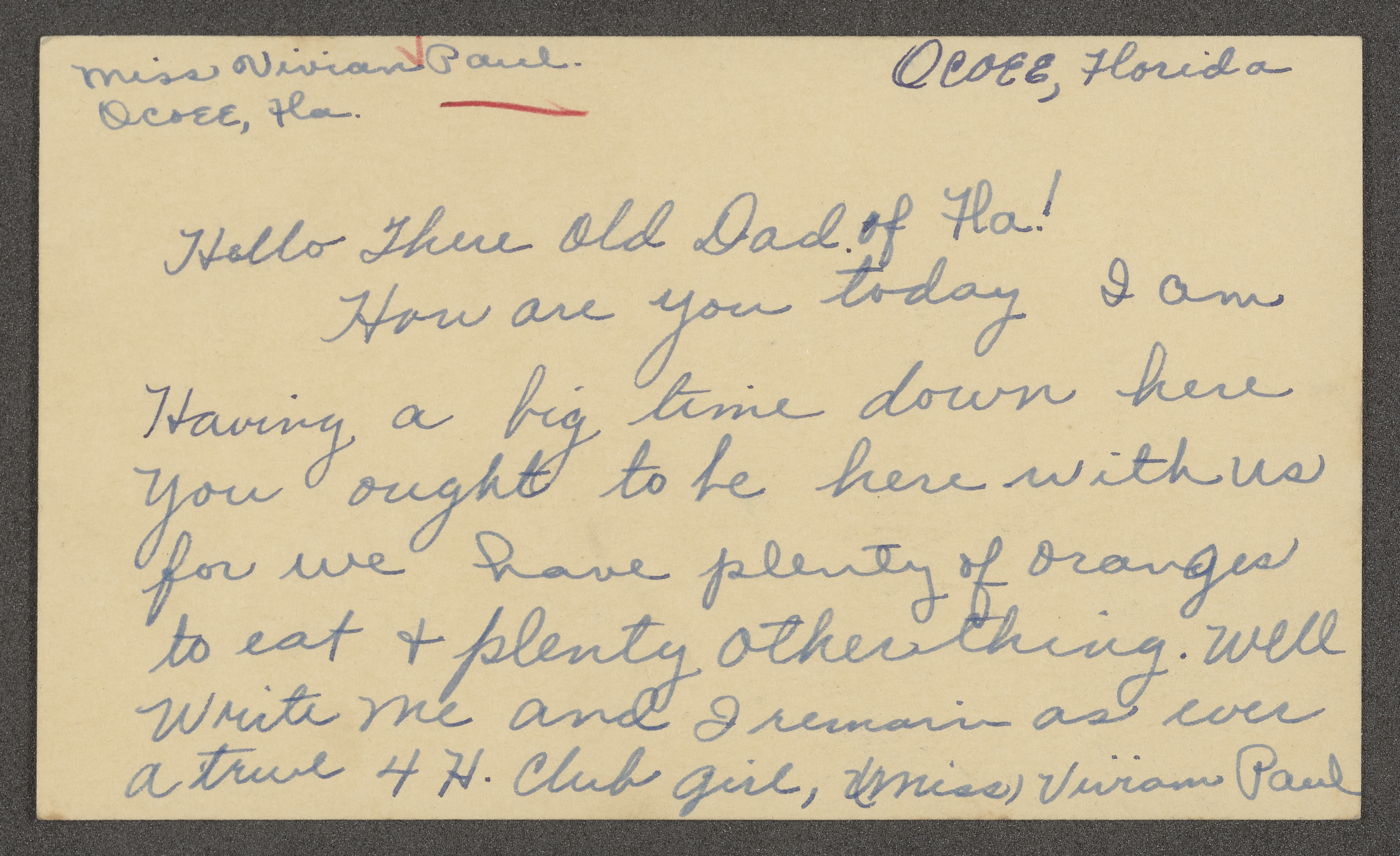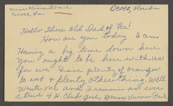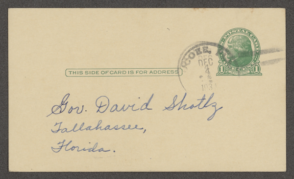 Postcard from Vivian Paul to Governor David Sholtz, 1931