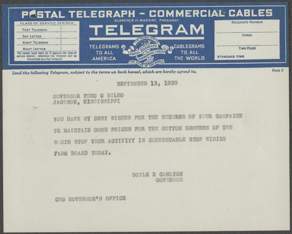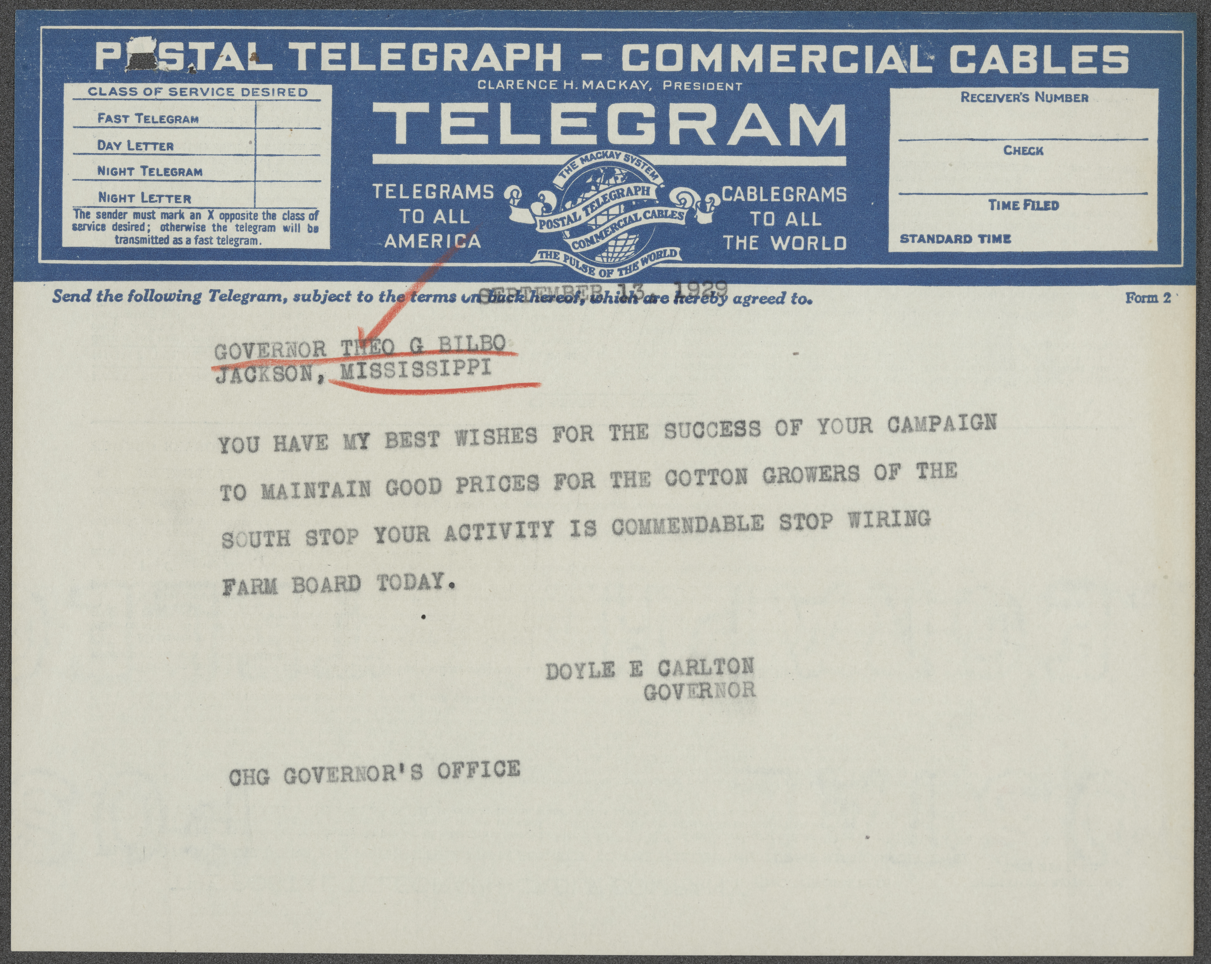Telegram from Governor Doyle E. Carlton to Governor Theodore G. Bilbo of Mississippi, 1929