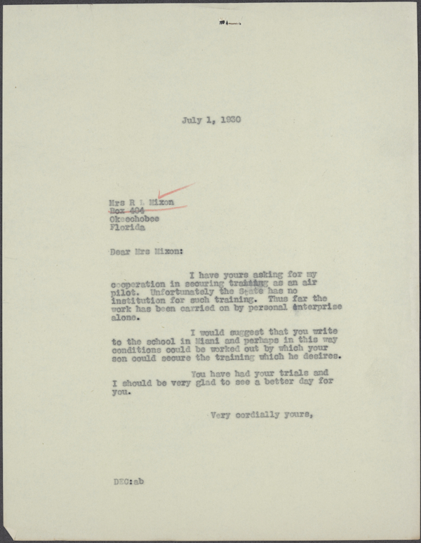 Letter from Governor Doyle E. Carlton to Mabel Ruth Mixon, 1930