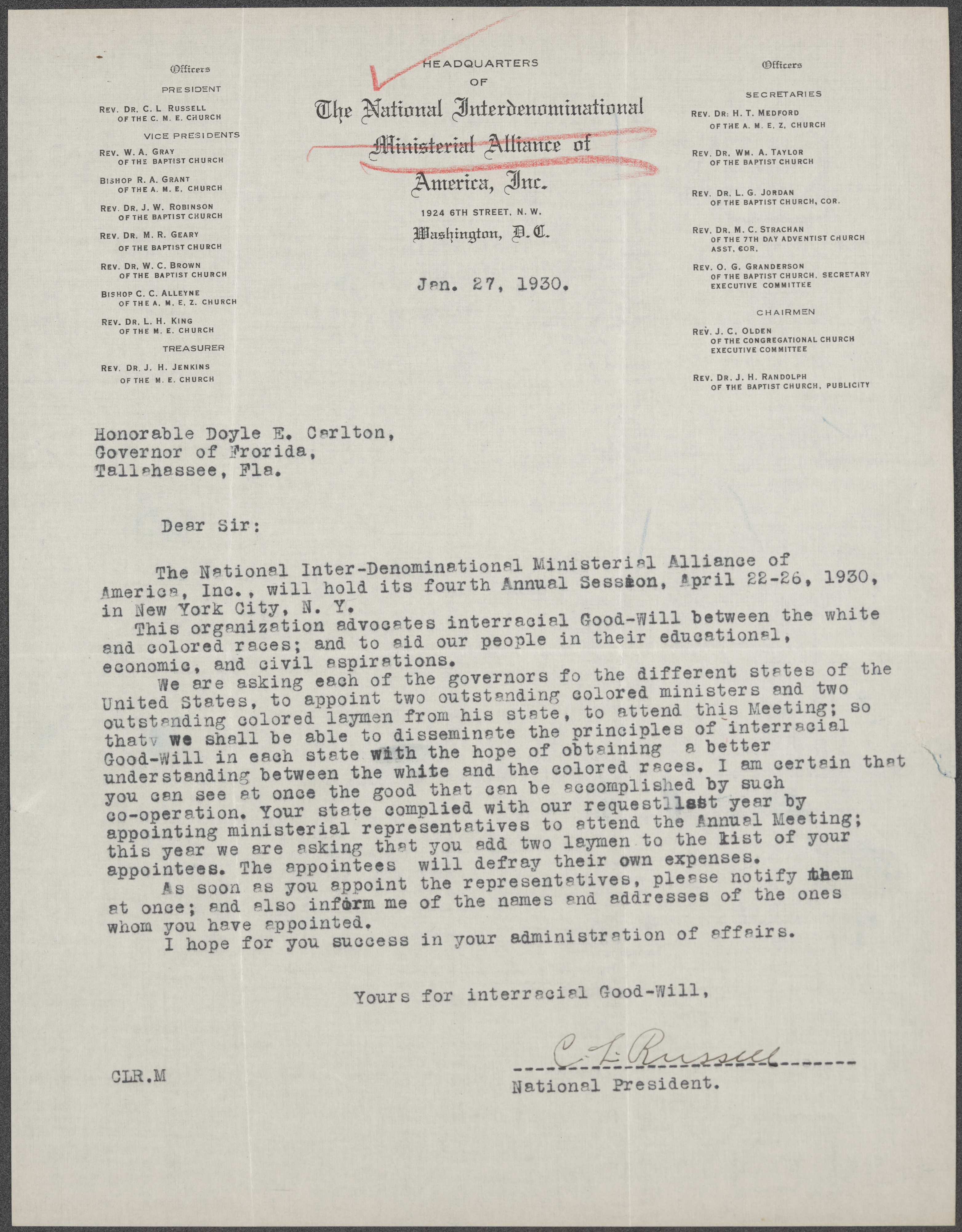 Letter from Reverend Dr. C. L. Russell to Governor Doyle E. Carlton, 1930