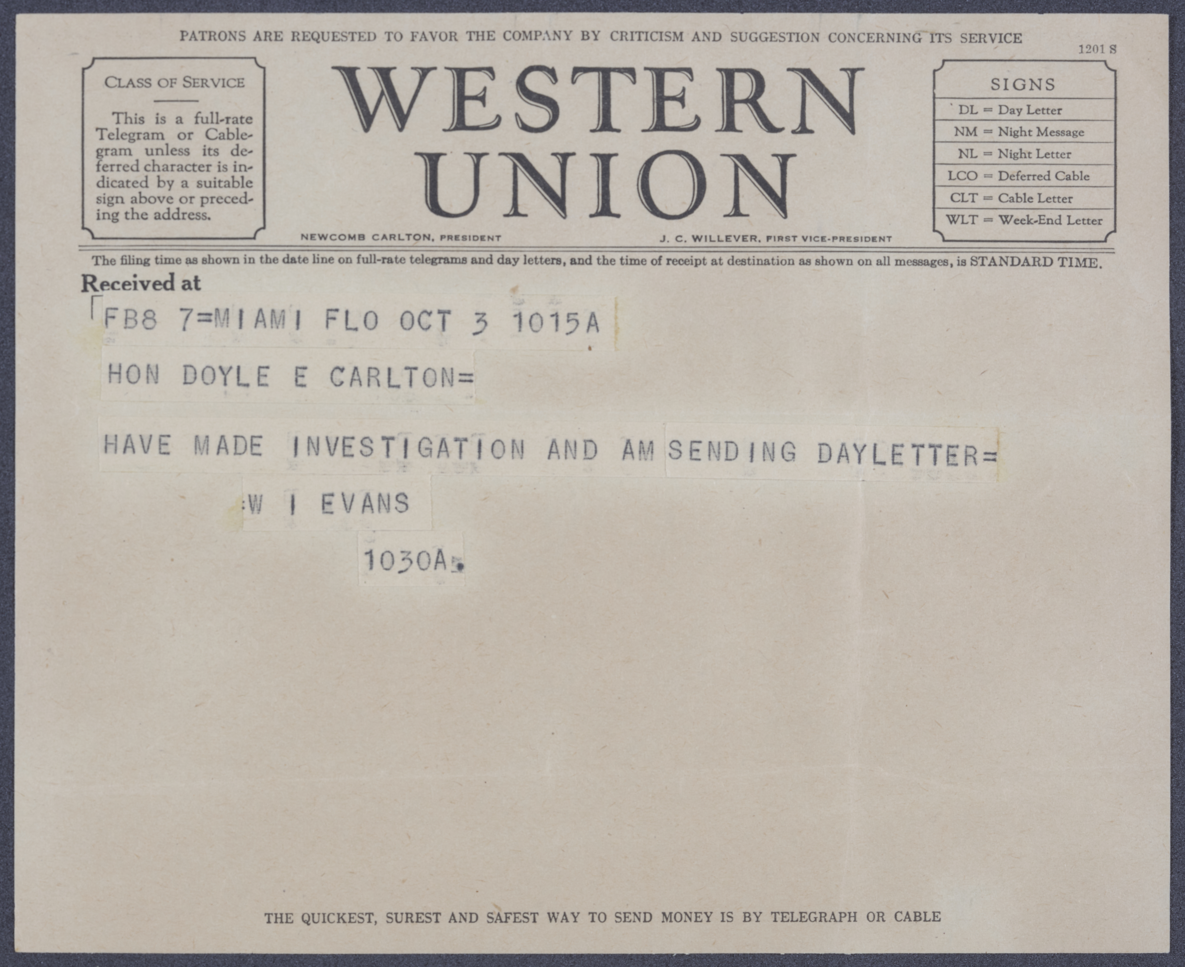 Correspondence Between W. I. Evans and Governor Doyle E. Carlton Regarding Storm Damage in Homestead, Florida, 1929