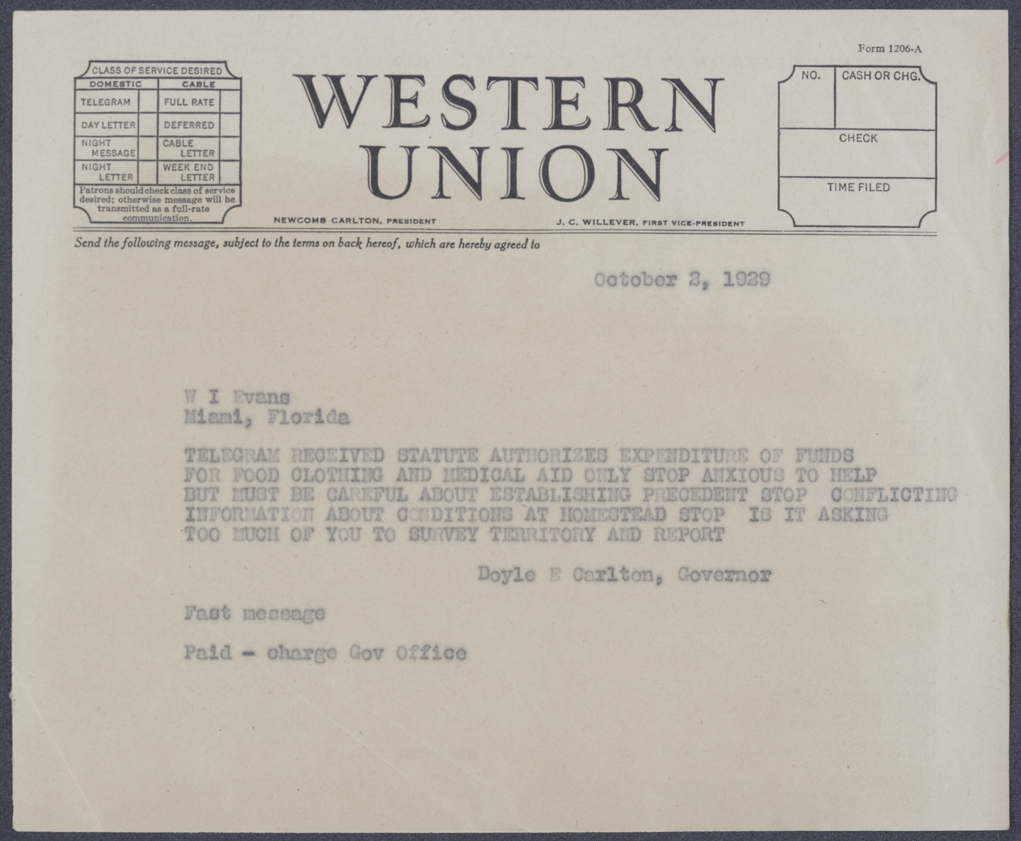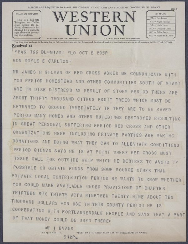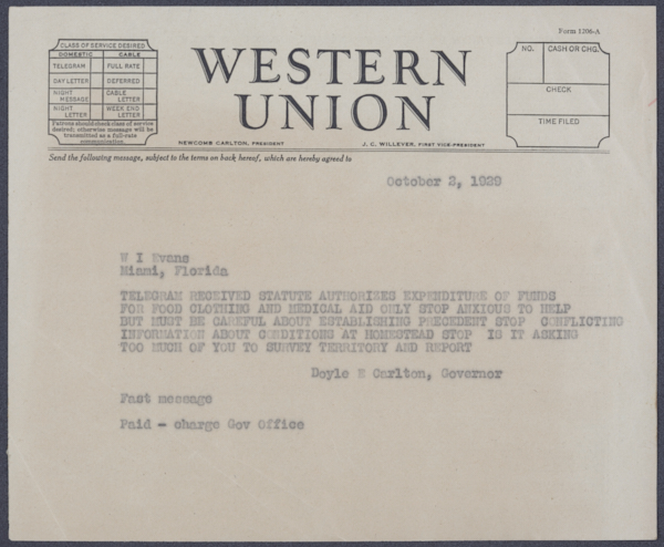Correspondence Between W. I. Evans and Governor Doyle E. Carlton Regarding Storm Damage South of Miami, 1929