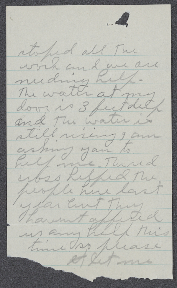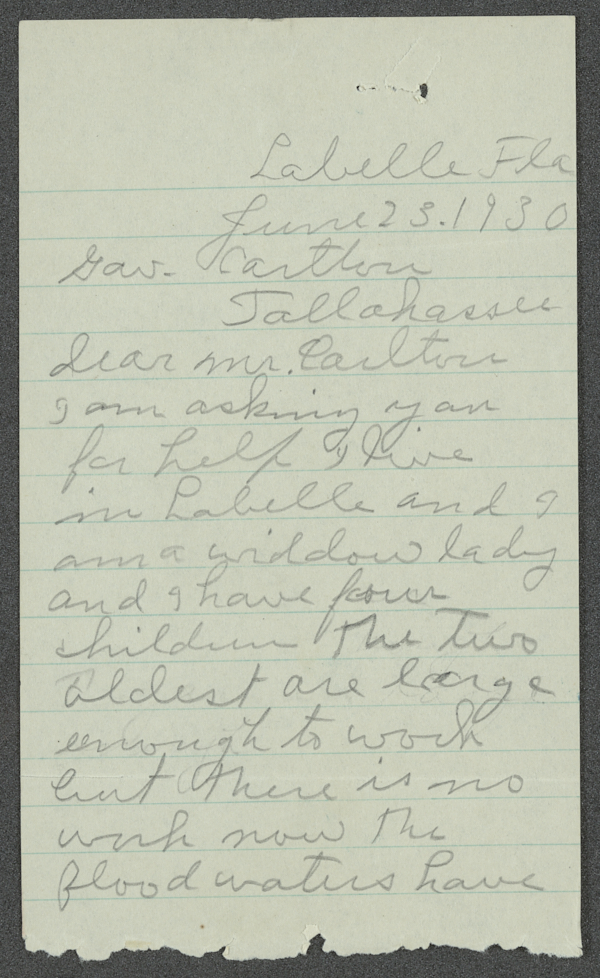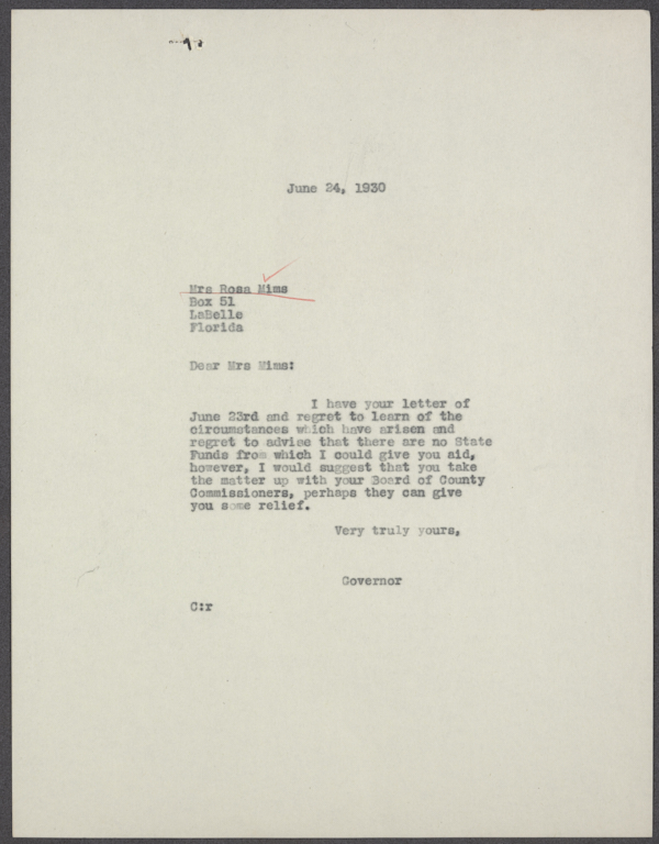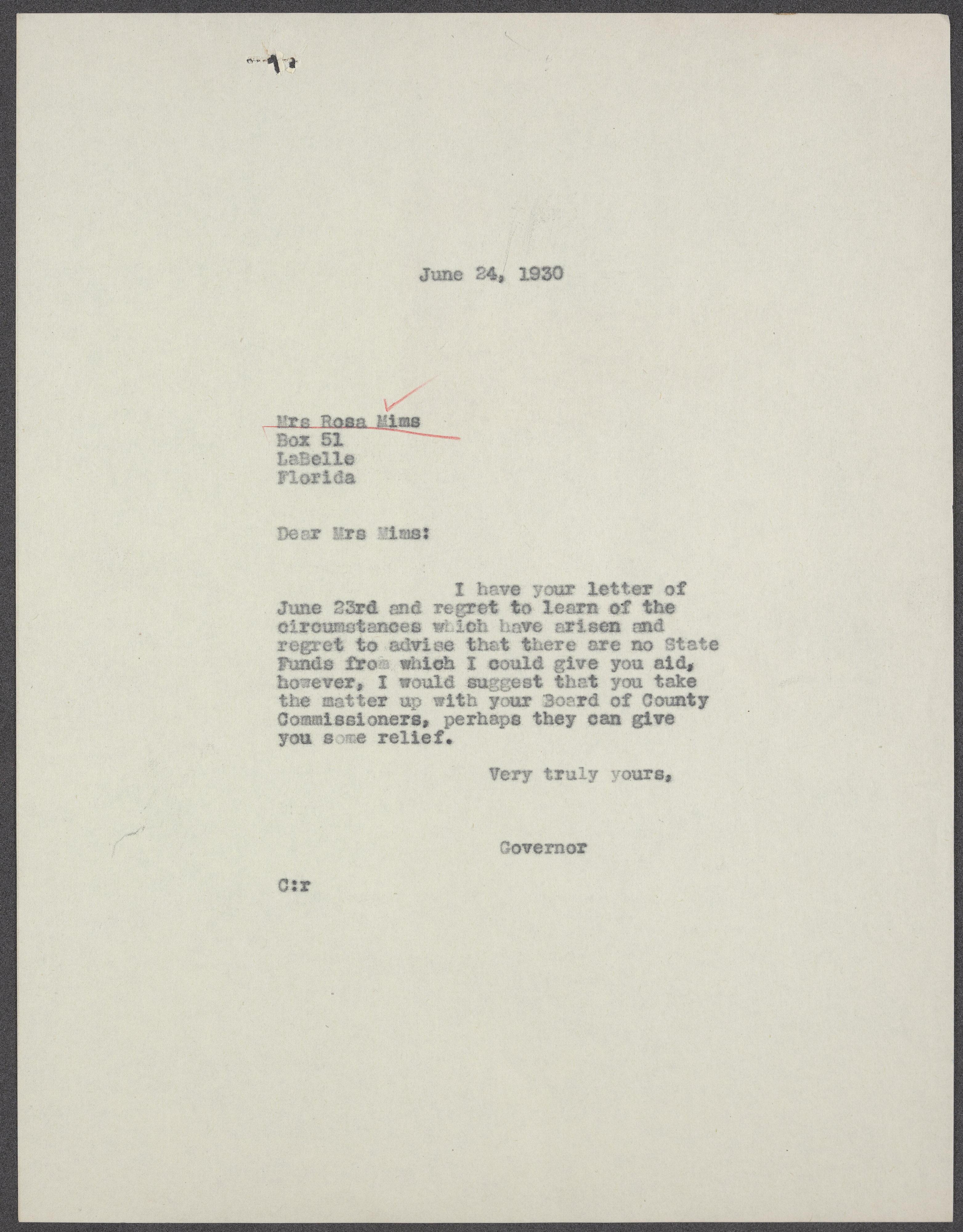 Correspondence Between Rosa Mims and Governor Doyle E. Carlton Regarding Flood Relief, 1930