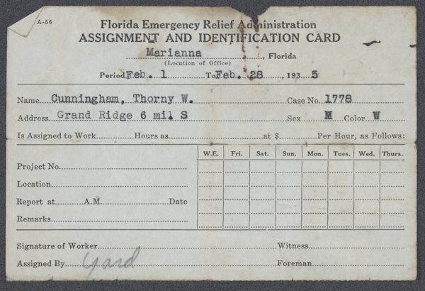 Florida Emergency Relief Administration Assignment and Identification Card for Thorny W. Cunningham, 1935