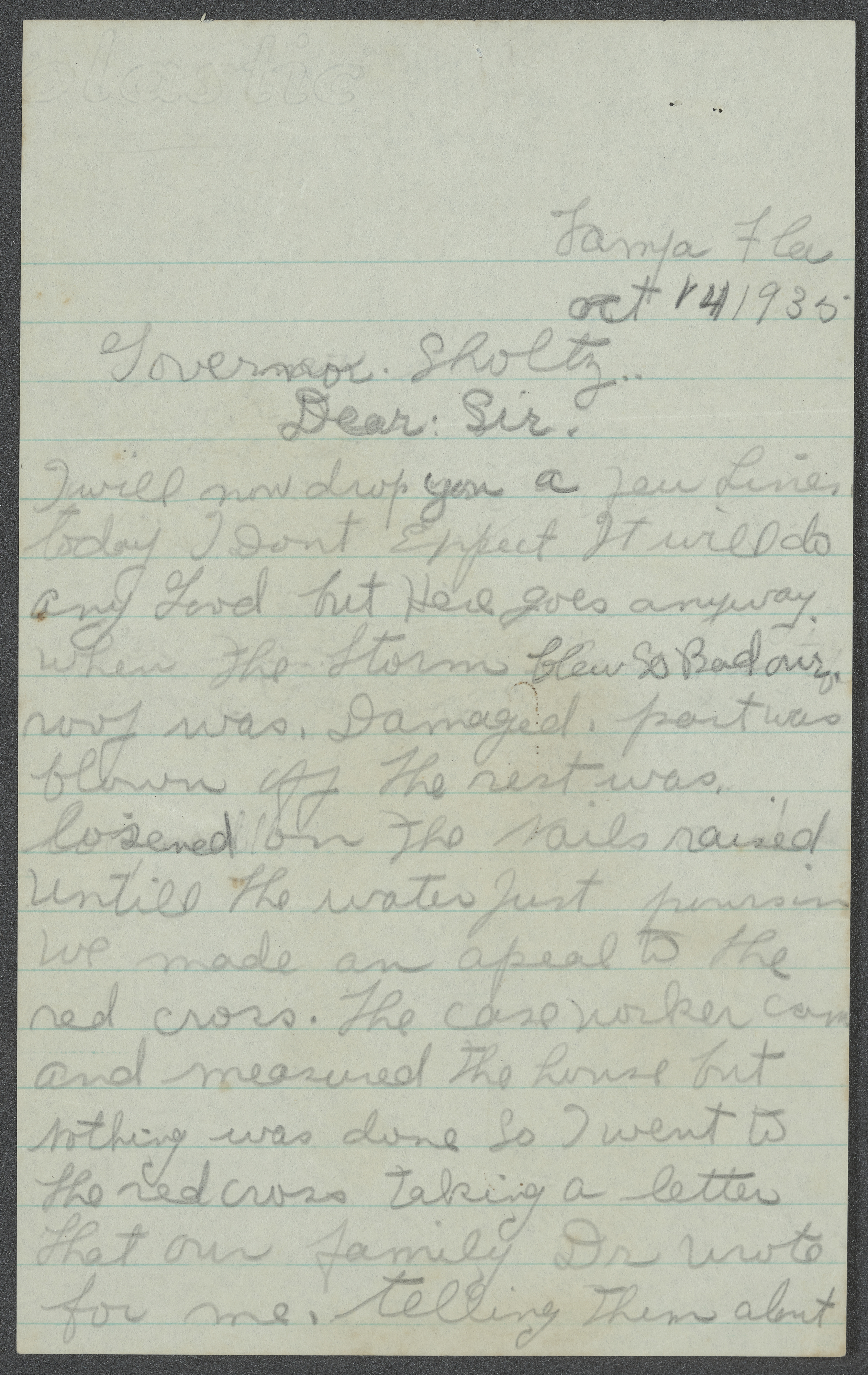 Curry, Delia. Letter from Delia Curry to Governor David Sholtz Regarding Storm Damage, 1935. 1935-10-14. State Archives of Florida, Florida Memory. <https://www.floridamemory.com/items/show/351437>, accessed 16 February 2026.